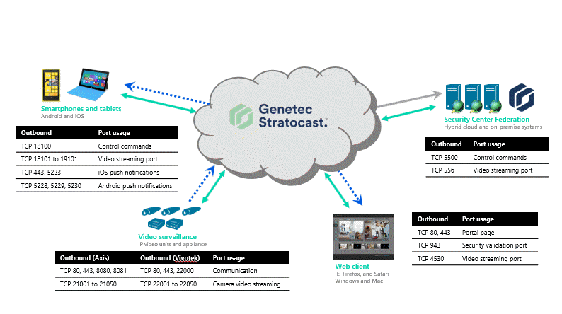 The following table lists the ports that you must open for outbound traffic, so that Security Center users can connect to Stratocast™.
